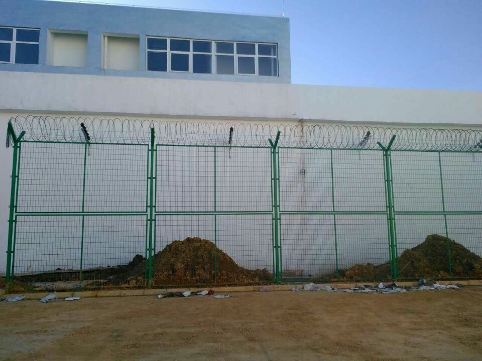 监狱钢网墙护栏网与普通护栏网最大的不同在于监狱护栏网顶部的V型支架,这些V型支架与支柱焊连在一起,坚固又牢靠,你不必担心它在坚固性方面的问题,而且这种形状给人一种大气的感觉,美观程度顿时提升了不少。V型支架的上部缠绕有普通刺绳,让人无法爬越过去,V型加强筋让网片更加更加牢固,能抵抗更强大的冲击力。